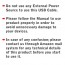 • Do not use any External Power Source to use this USB Cable. Please follow the Manual to use product properly in order to avoid unnecessary damage to your devices. In case of any confusion; please contact us through Amazon mail system for any technical details of this product before you start to use it.